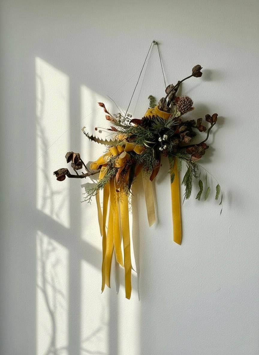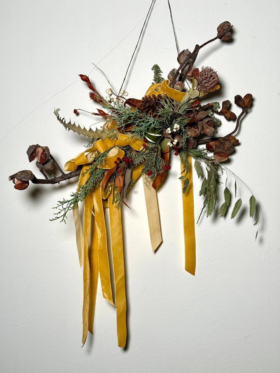 Jiminy Cricket is our unique spin on the traditional Christmas wreath silhouette, this features Hakea Peach branches ("Cricketball protea") as a base and a carefully curated adornment of dried and preserved botanicals in beautiful, natural rustic hues.