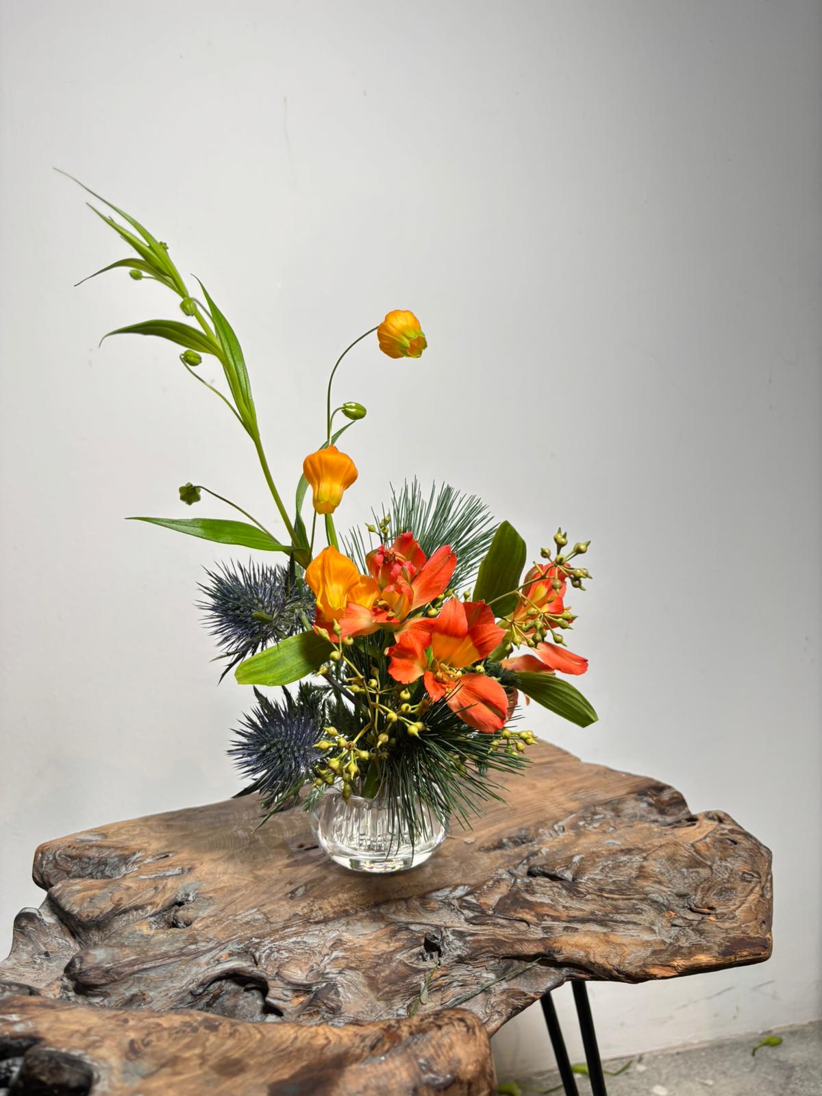 Photos are for illustrative purposes only and do not reflect selection of flowers or include surrounding props. Actual arrangement for fresh botanical add-on will be using seasonal flowers omakase style.