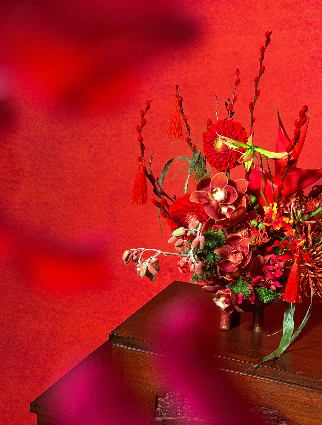 Echoing this powerful legacy, the arrangement features rare dahlia for strength and distinction, auspicious cymbidium for prosperity and noble standing, alongside heliconia and orchids that bring height, movement, and vibrant life. Together, these blooms create a dynamic, celebratory composition in rich festive tones—perfect for welcoming the Year of the Horse.