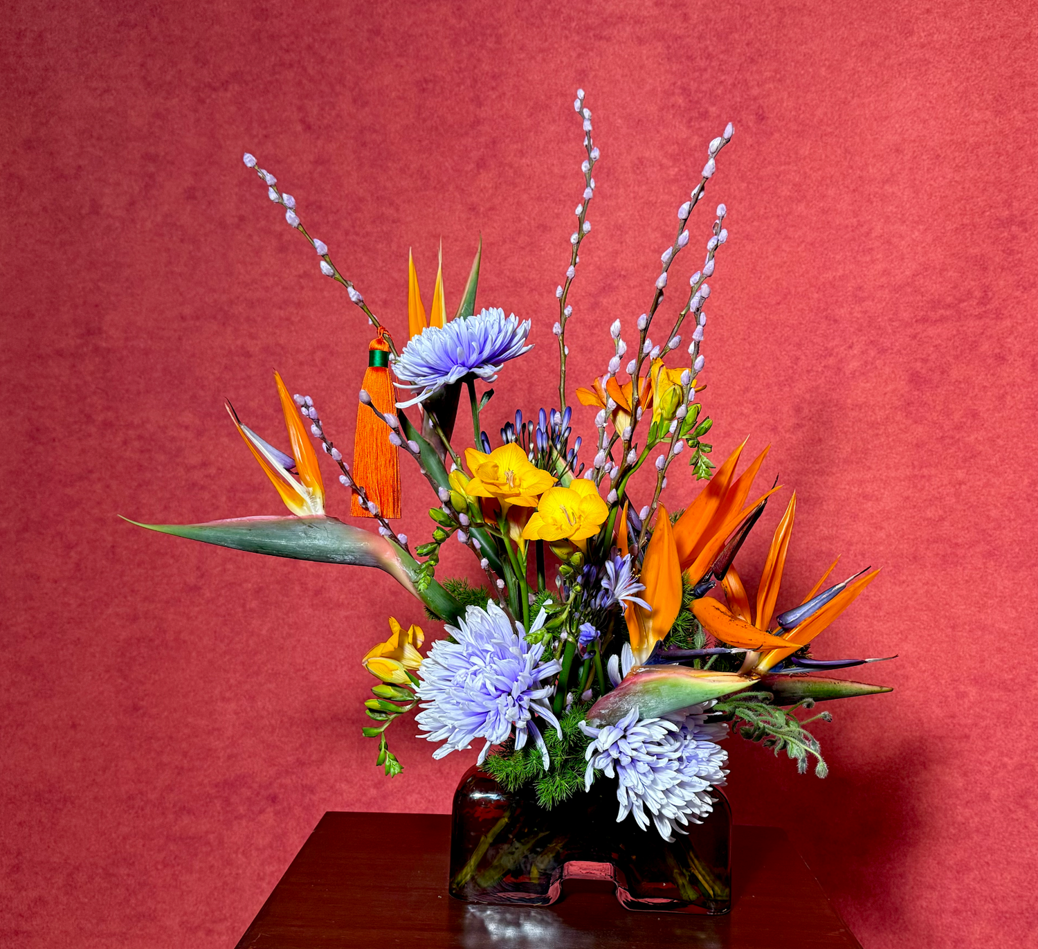 This modern arrangement of Birds of Paradise with Chrysanthemum is a beautiful wish for the Year of the Horse: for swift advancement in one’s endeavors, smooth journeys wherever life leads, and good news arriving again and again throughout the year.