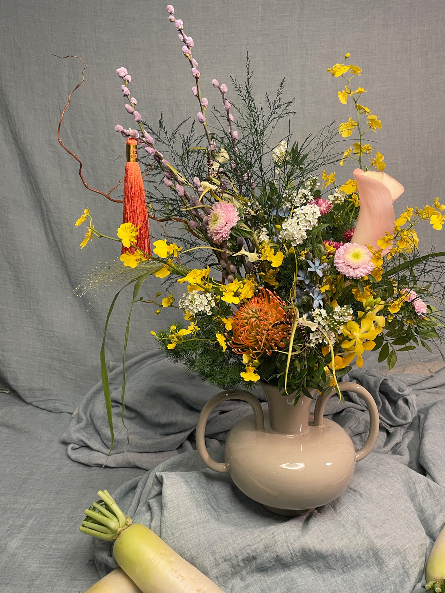 Photos are for illustrative purposes only and do not reflect selection of flowers or include surrounding props. Actual arrangement for fresh botanical add-on will be using seasonal flowers omakase style.
